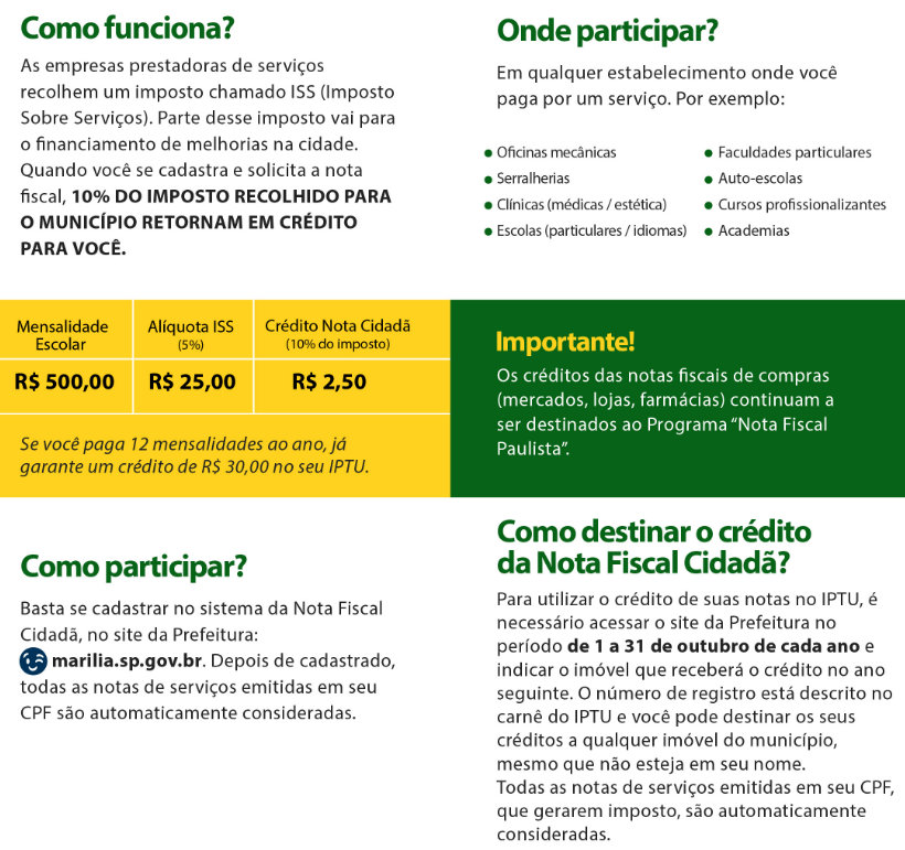 O contribuinte pode pedir a Nota Fiscal Cidadã em qualquer estabelecimento de Marília em que pagar por um serviço, como oficinas mecânicas, academias, escolas particulares, escolas profissionalizantes, autoescolas, cursos de idiomas, faculdades particulares, clínicas médicas, entre outros.