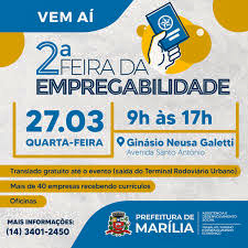 A 2ª Feira da Empregabilidade de Marília será realizada nesta quarta-feira (dia 27), das 8 às 17 horas, no ginásio de esportes Neusa Galetti. Milhares de pessoas vão passar pelo local em busca de uma oportunidade para sair do desemprego ou alcançar objetivos maiores na carreira.