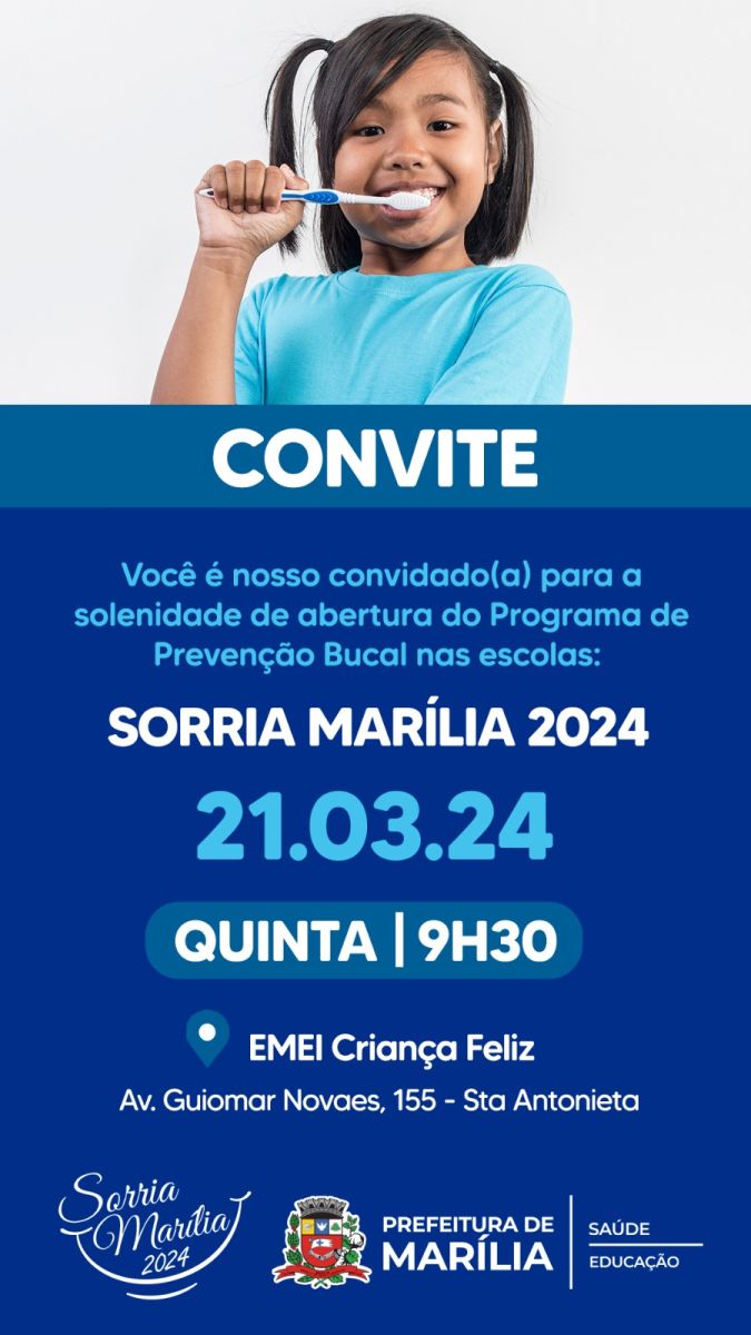 As Secretarias Municipais da Saúde e da Educação de Marília realizam nesta quinta-feira (dia 21) o lançamento da 22ª edição do Programa Sorria Marília. O evento será na Escola Municipal de Ensino Infantil (Emei) Criança Feliz (bairro Santa Antonieta) na zona Norte da cidade, a partir das 9h30.