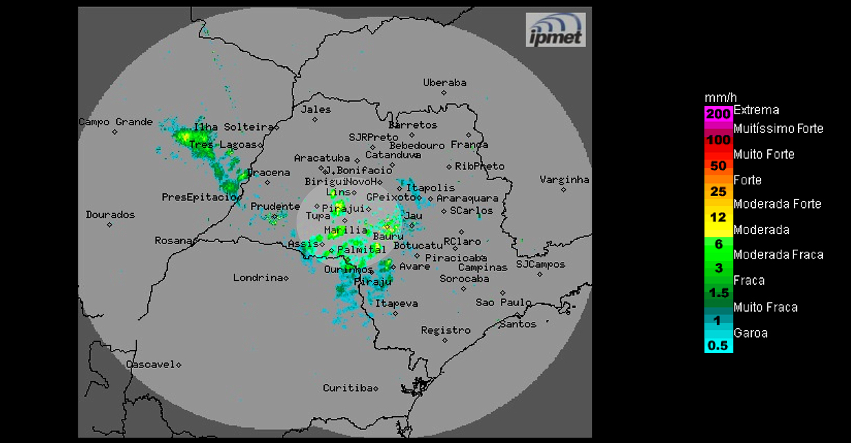 Os radares meteorológicos do IPMet/UNESP, localizados em Bauru e Presidente Prudente, estão detectando chuvas isoladas, fracas a moderadas, no oeste, centro e sul do estado de São Paulo, atingindo entre outros municípios: Álvares Machado, Anhumas, Taciba, Cândido Mota, Arco-Íris, Santa Cruz do Rio Pardo, Itápolis, tabatinga e Itapeva. Chove também no Paraná, na divisa com São Paulo.