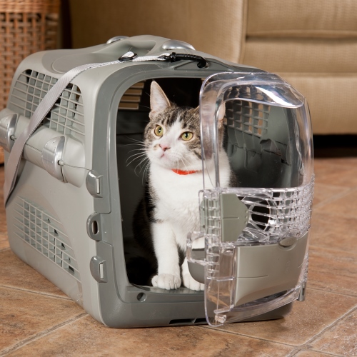 Os gatos a melhor opção seria a tradicional caixa de transporte, assim eles se sentem mais seguros e protegidos, sem risco de se ferirem.
