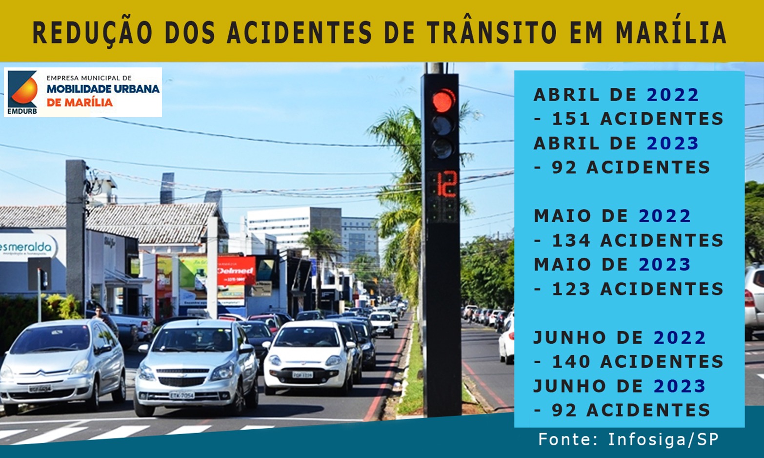 A cidade de Marília teve uma redução de 28% no número de acidentes no último trimestre (abril, maio e junho) em relação ao mesmo período do ano passado. Em 2022, foram registradis 425 acidentes enquanto que neste ano (mesmo período) foram 307 ocorrências.