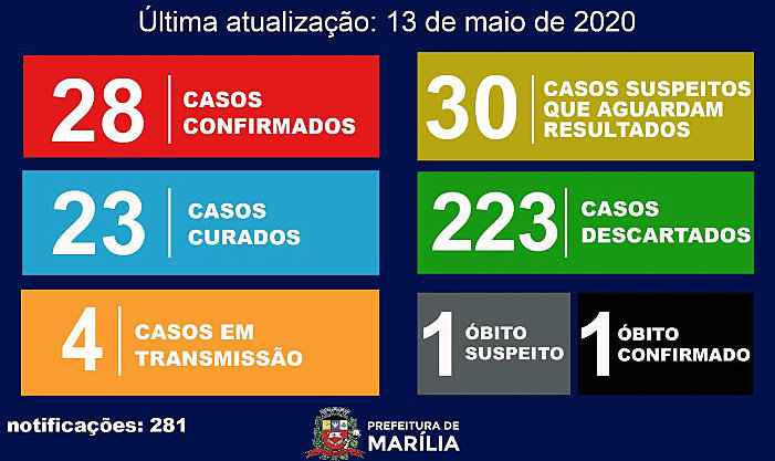Pelos números divulgados nesta quarta-feira, a cidade continua com 28 casos confirmados. Apenas a quantidade de exames descartados é que subiu de 218 para 223.