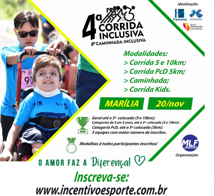 Evento conta com idealização de Famema, HC Marília e Centro de Reabilitação Lucy Montoro, com organização da MLF Eventos. Realizada em Marília, a 4ª Corrida e 6ª Caminhada Inclusiva 2022 acontece no dia 20 de novembro e terá largada às 7h30, em frente ao Colégio Criativo.