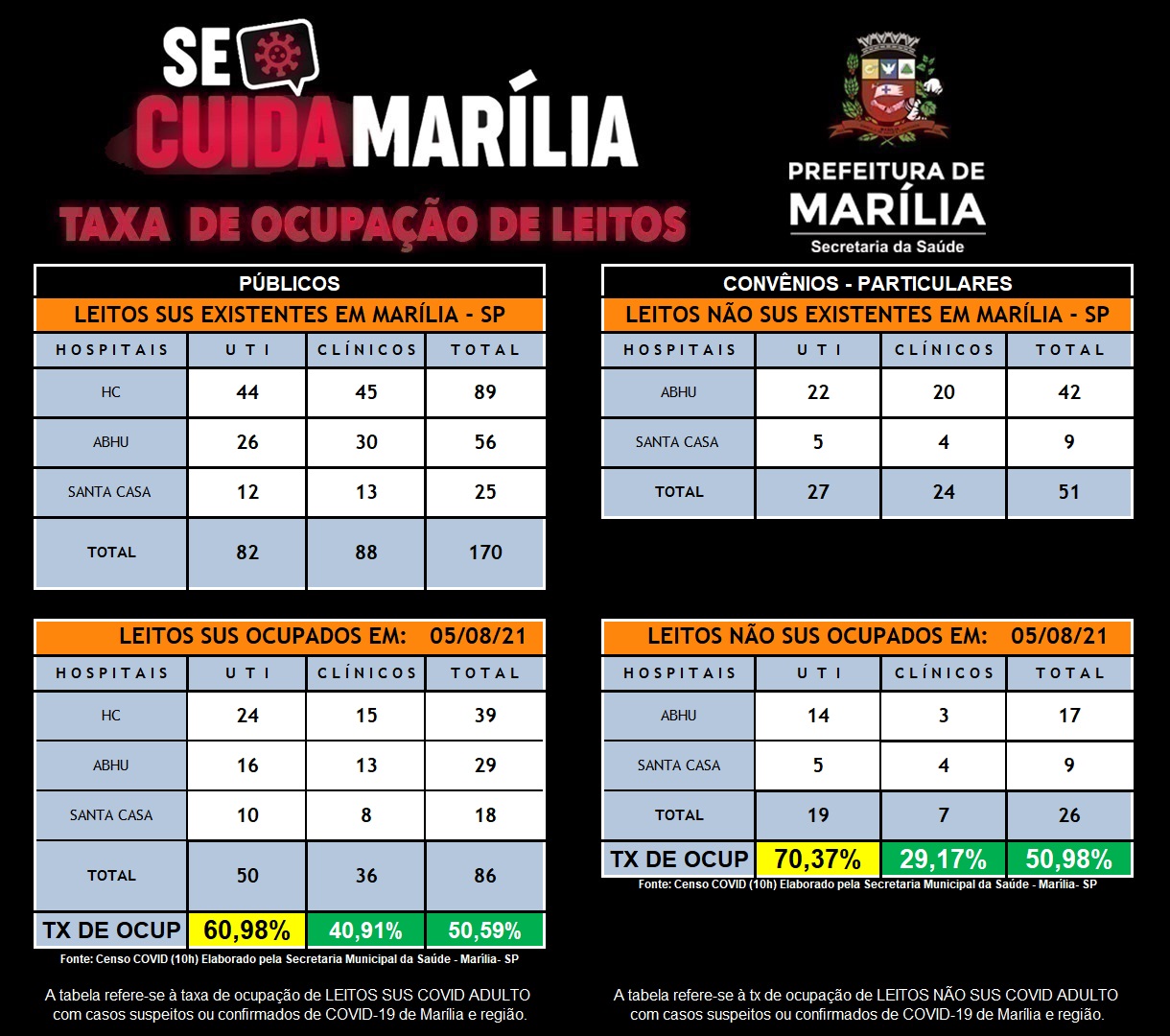 Já dos 27 leitos particulares/convênios, 19 permanecem ocupados (taxa de 70,37%), novamente com a Santa Casa que está com 100% de ocupação. Ambas as situações na chamada faixa "amarela".