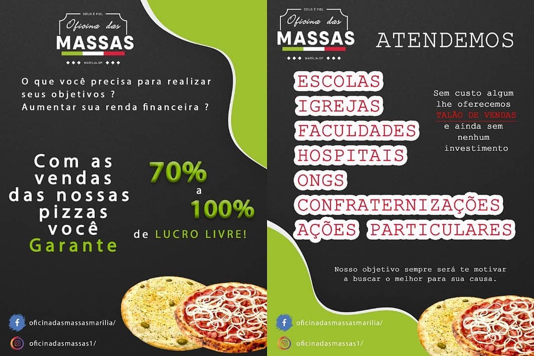 Trata-se da Oficina das Massas, a única da cidade e região que fornece pizzas semi-prontas de excelente qualidade (já em embalagem individual) exclusivamente para serem revendidas em campanhas, com excelentes lucros às entidades, normalmente de 70 a 100%.