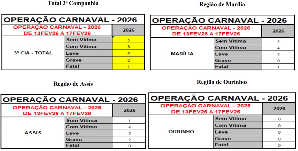 O 2º Batalhão da Polícia Rodoviária Estadual, divulgou o balanço da Operação “Carnaval 2026”, realizada entre os dias 13 e 17 de fevereiro, nas regiões de Marília, Assis, Tupã e Ourinhos. Houve um crescimento do número de flagrantes de motoristas dirigindo embriagados e também de crianças que não estavam nas cadeirinhas.