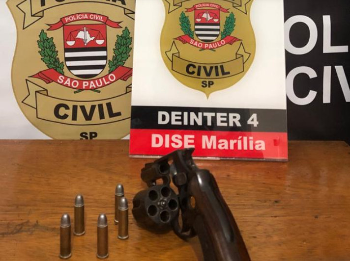 Ao ser avistado o criminoso tentou fugir e jogou um revólver calibre 38, (sem numeração e com cinco munições intactas), pela janela do apartamento.