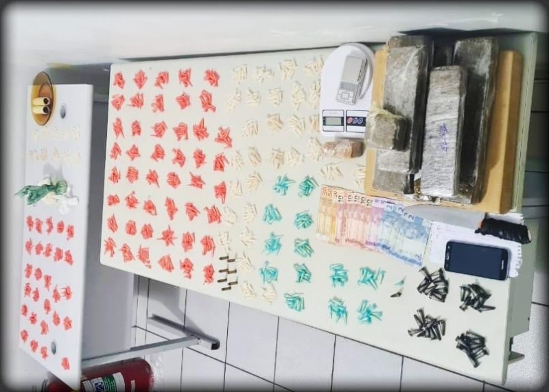 Mais drogas foram localizadas no forro do quarto da casa dele. Com o auxílio de cães farejadores, a droga, sete munições de calibre 38, apetrechos e o dinheiro, foram localizados. O total apreendido foi de 10 tabletes de maconha que pesaram 10,5 kg, pinos de crack e cocaína.