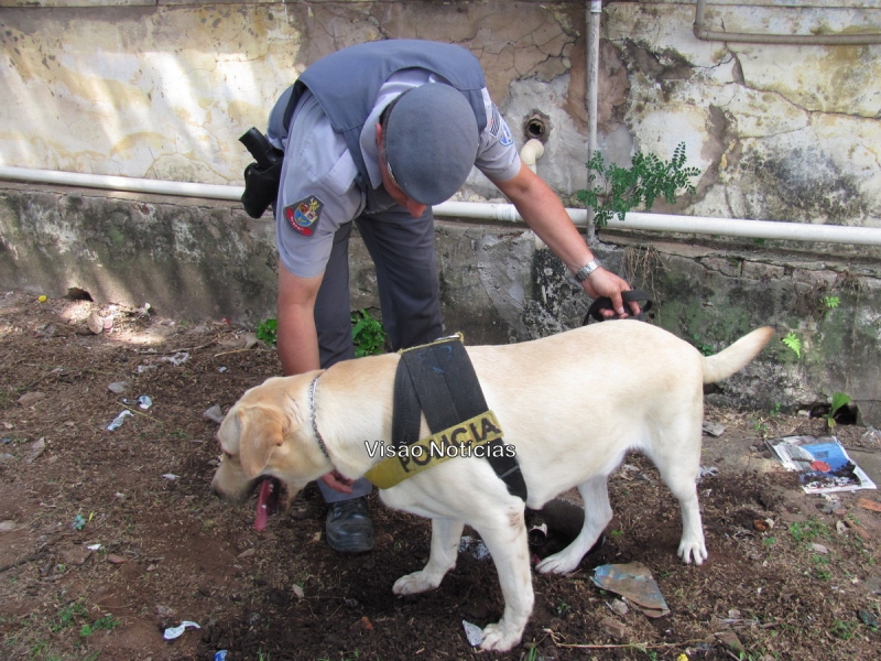 O cão farejador da PM fez uma varredura pelo imóvel e conseguiu localizar três tabletes de tamanho médio contendo maconha, enterrados no quintal da residência.