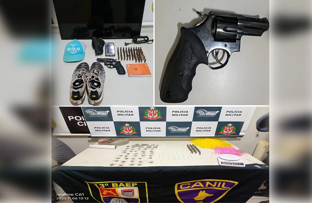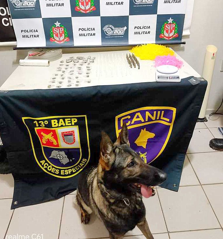 No local, com apoio da equipe de Canil do 13º BAEP e do cão policial: Kaya, foram apreendidos 118 microtubos de cocaína, outros 28 de crack, 43 porções de maconha e 1.500 microtubos vazios e diversos apetrechos utilizados para o preparo e a comercialização dos entorpecentes. O homem foi preso em flagrante por tráfico, posse ilegal de arma de fogo e receptação, ficando à disposição da justiça.