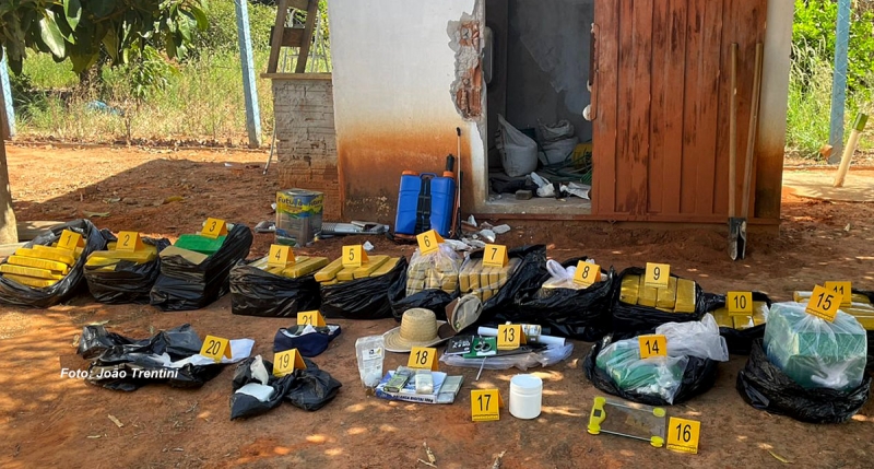 No local, foram localizados, dentro de um cômodo fechado, 290 tabletes de maconha (mais de 230kg) e dois tabletes de pasta base de cocaína (quase 1,5kg), várias balanças, anotações relacionadas ao tráfico e material para embalar a droga.