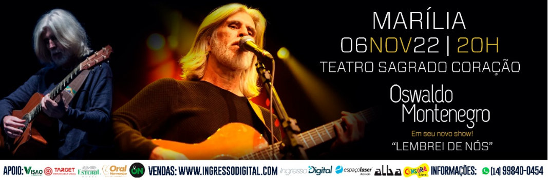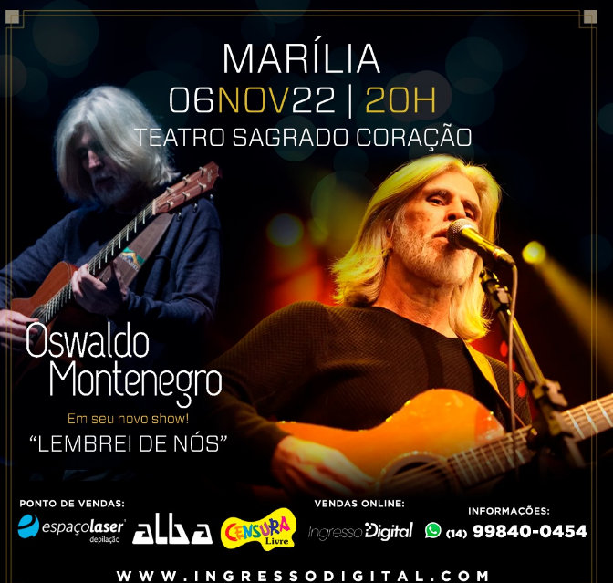 Aviva Produções traz para Marília, o cantor-compositor, Oswaldo Montenegro que batendo papo com o público, atenderá os pedidos musicais e conta casos sobre sua longa trajetória. Montenegro transforma o momento num encontro especial entre artista e plateia.