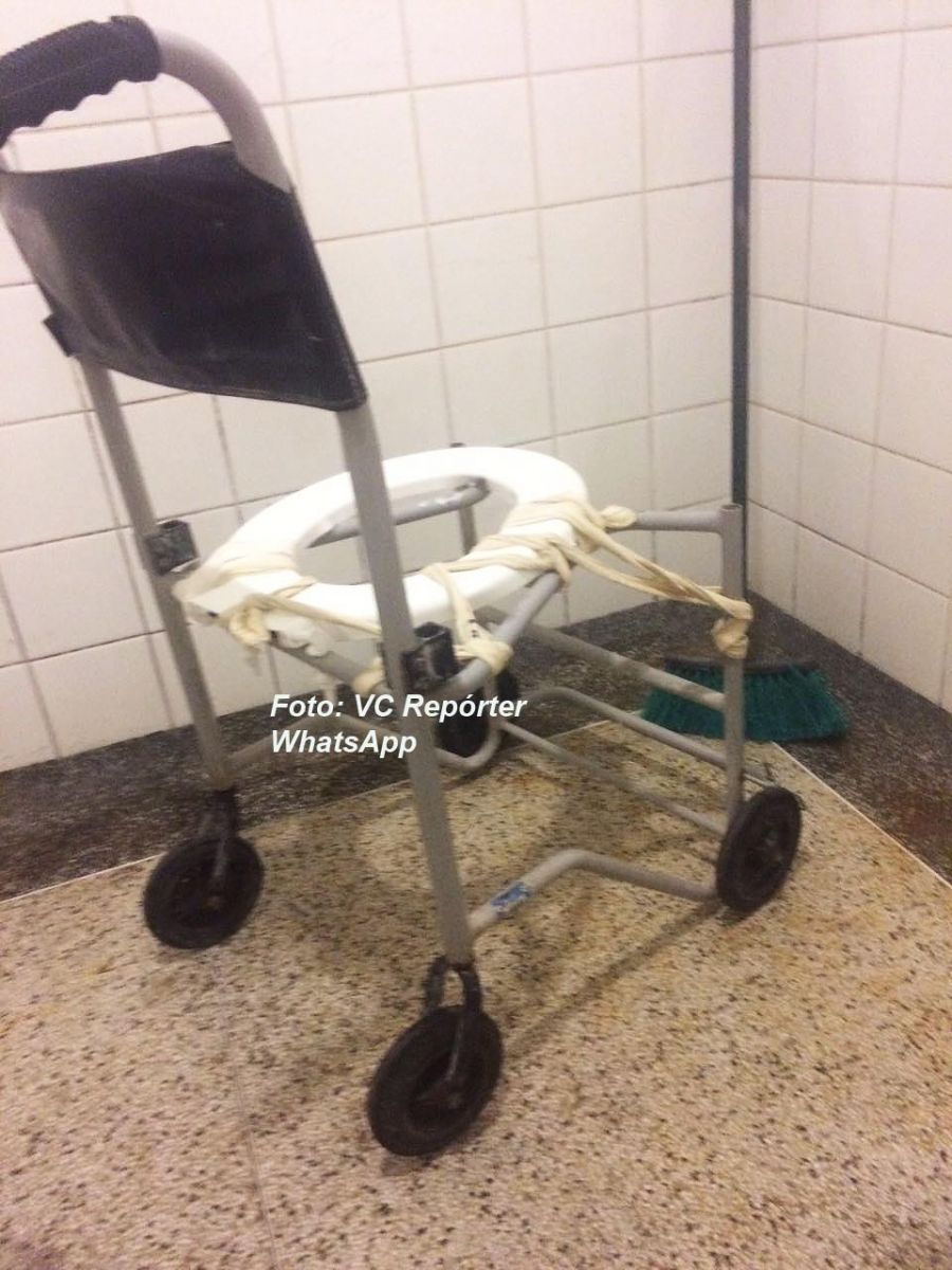 Um banheiro coletivo em péssimas condições para dezenas de pacientes, equipamentos quebrados (cadeira de tomar banho amarrada com faixas), ficar 14 dias