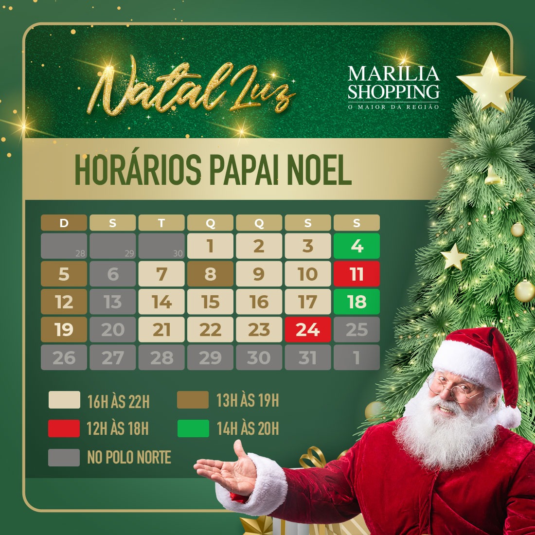 Para que os visitantes possam conversar com o bom e simpático velhinho, ele estará no Marília Shopping até o dia 24 de dezembro, de terça a sexta das 16h às 22h; aos sábados das 14h às 20h e aos domingos e feriados das 13h às 19h. Nos dias 11 e 24 de dezembro, o horário de visitação será das 12h às 18h.