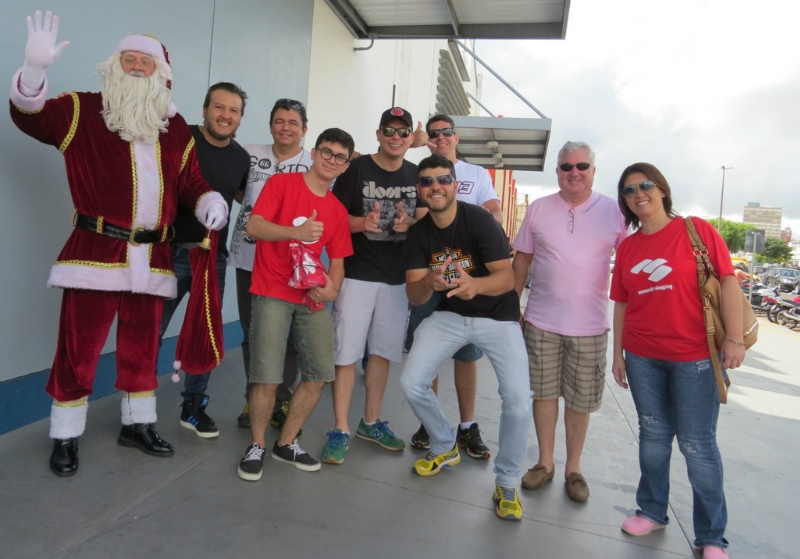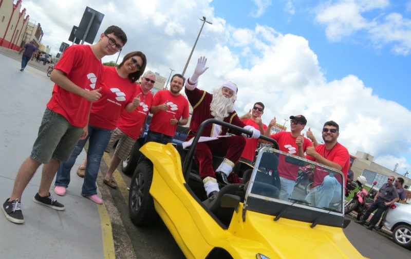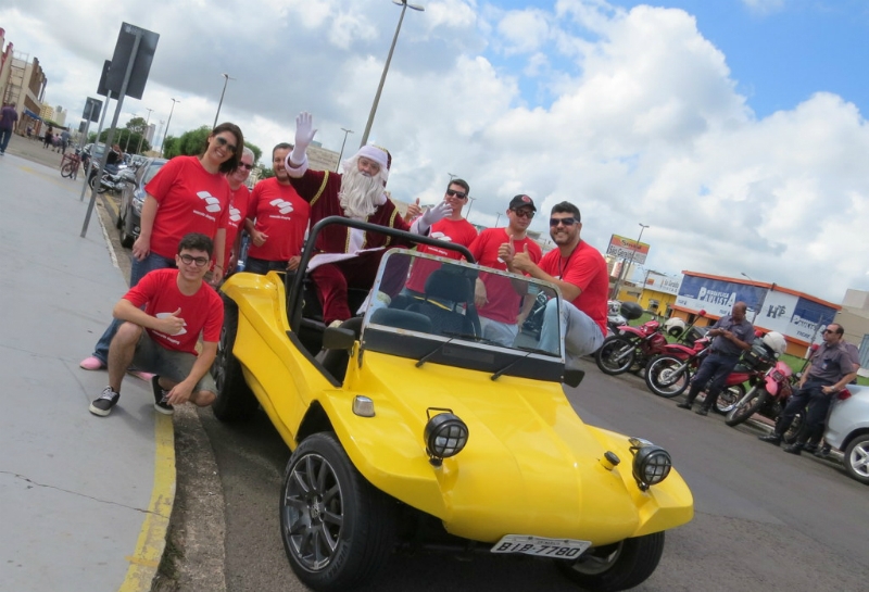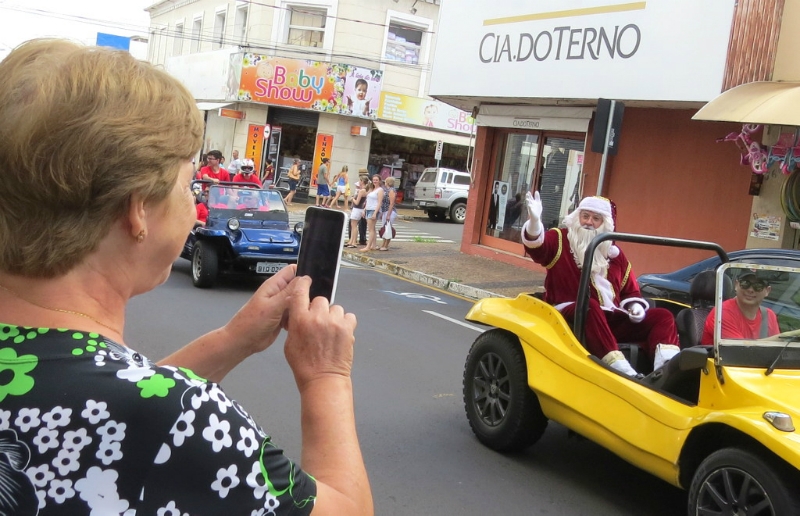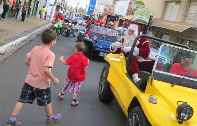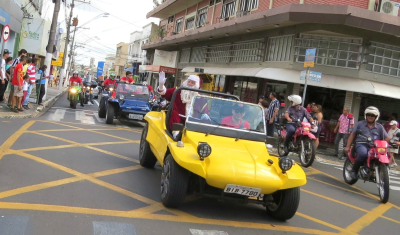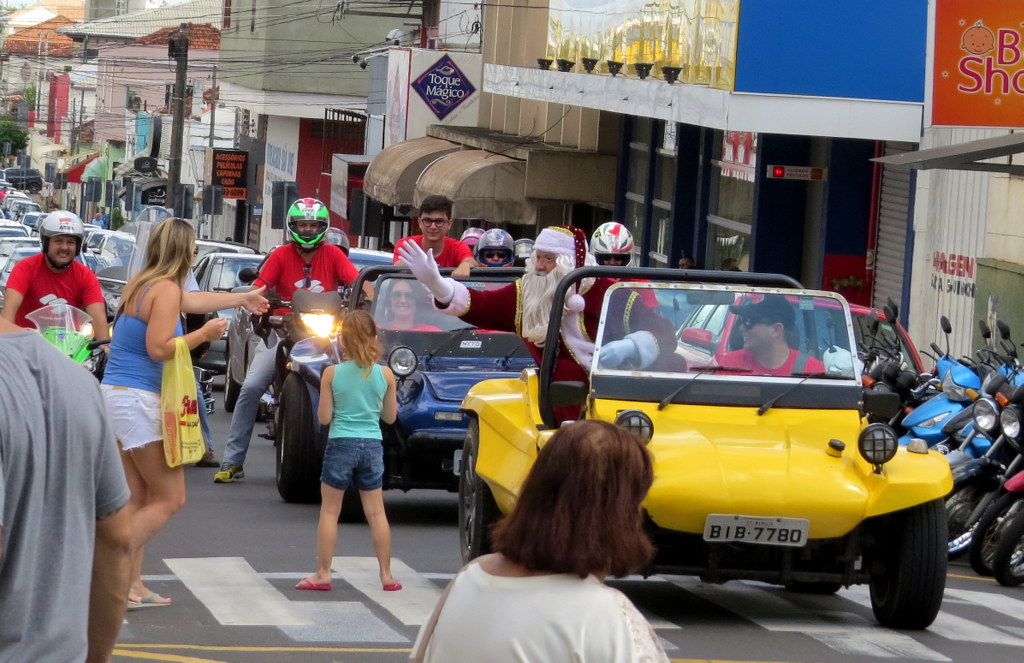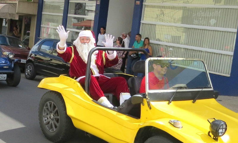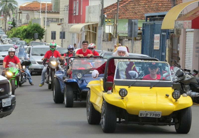 Ele decidiu trocar o tradicional trenó por um veículo bem mais moderno: num buggy e foi acompanhado por uma equipe de motoqueiros da cidade que também chamou a atenção pelo ronco forte dos motores. A carretada começou pela rua 4 de Abril, passou pelas principais ruas da cidade e terminou no Esmeralda Shopping.