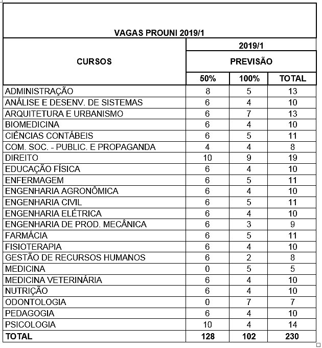 No primeiro semestre de 2019, por exemplo, a Universisade oferta 230 bolsas do Programa Universidade Para Todos (ProUni), do Governo Federal.