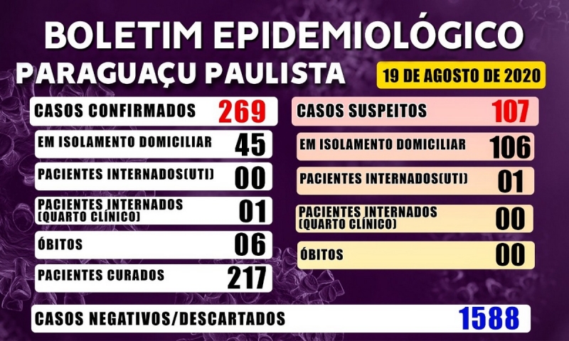 - 269 casos positivos confirmados de Covid-19, sendo: 217 pacientes que estão recuperados, conforme avaliação médica; 45 pessoas que estão em isolamento domiciliar; um paciente que está internado em quarto clínico do Hospital Santa Casa de Misericórdia de Paraguaçu Paulista; e seis óbitos.
