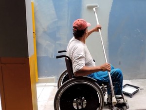 Para desempenhar a função de pintor, o ex-taxista - que faz uso de uma cadeira de rodas para se locomover - teve que inventar um equipamento para lhe ajudar a pintar as paredes do prédio. "Eu fiz uma vara para poder pintar as paredes e com ela eu faço tudo. Consigo lixar e até passar massa", garante.