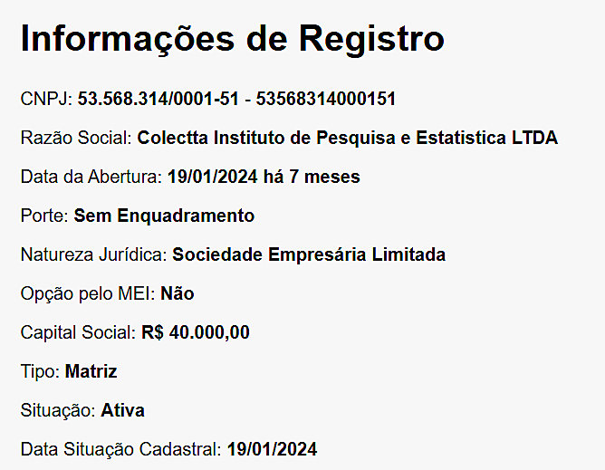 No caso da divulgação dos dados, hoje pela imprensa, a empresa responsável pela pesquisa (Colectta Instituto de Pesquisa e Estatística Ltda) foi criada há apenas sete meses, sem informar o valor de faturamento da empresa, índices locais de aplicação da pesquisa, ou seja, segundo o PL, estaria descumprindo requisitos contidos na legislação eleitoral.