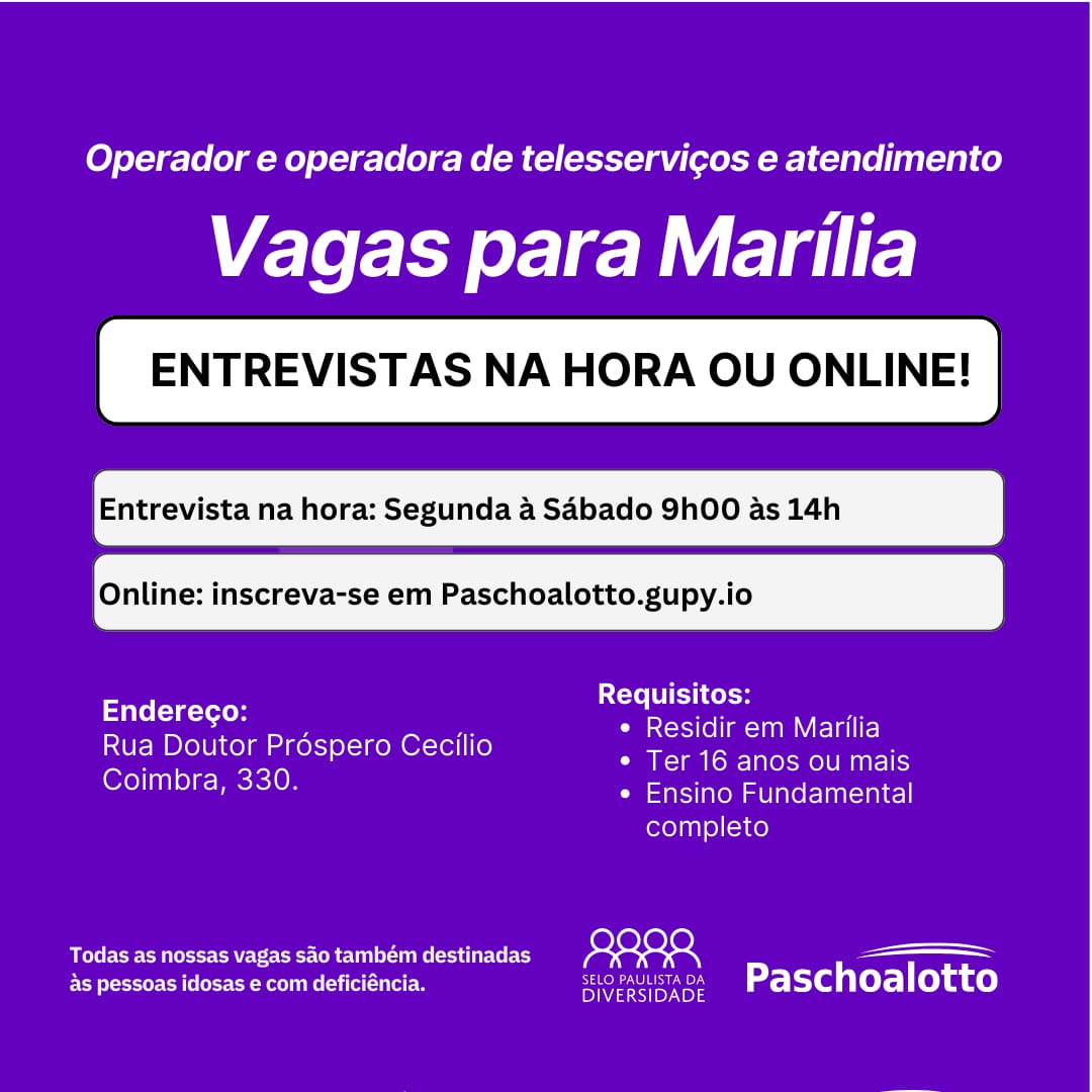 Interessados devem comparecer munidos de documentos pessoais na Rua Dr. Próspero Cecílio Coimbra, 330 (Paschoalotto People Center Marília). Entrevistas serão realizadas presencialmente de segunda a sexta-feira às 9h e 14h30. Currículos também podem ser cadastrados no link https://paschoalotto.gupy.io/