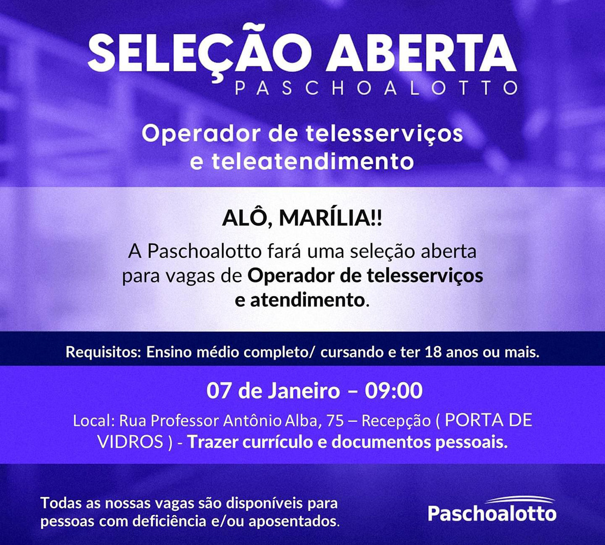 A Paschoalotto, empresa líder nacional em recuperação de crédito, atendimento ao cliente, relacionamento, tecnologia, dados e inovação, vai realizar a primeira seleção aberta para operação de telesserviços e de atendimento do ano, em Marília.