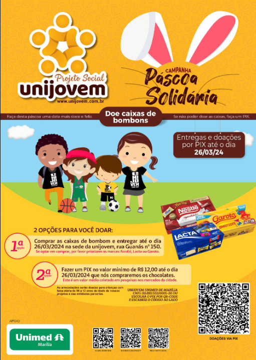 A Páscoa está chegando e a Unijovem está organizando mais uma edição da campanha Páscoa Solidária. O objetivo é proporcionar mais alegria à crianças carentes, entre seis e 12 anos, integrantes dos projetos e de entidades parceiras.