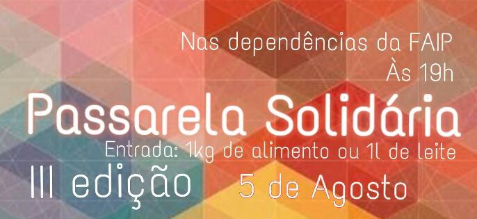 Jovens do programa Aprendiz Legal do CIEE de Marília, em parceria com os cursos de Pedagogia e Agência de Moda da FAIP, realizam nesta sexta (26), à partir das 19h, a terceira edição do "Passarela Solidária", um evento que visa arrecadação de alimentos e leites em prol do GACCH (Grupo de Apoio a Criança com Câncer e Hemopatias). Neste ano, também haverá a participação da ABRACE (Associação Brasileira de Assistência às Famílias de Crianças Portadoras de Câncer e Hemopatias).