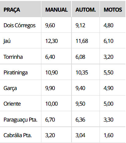 A atualização dos valores foi homologada pela ARTESP – Agência Reguladora de Transportes do Estado de São Paulo.