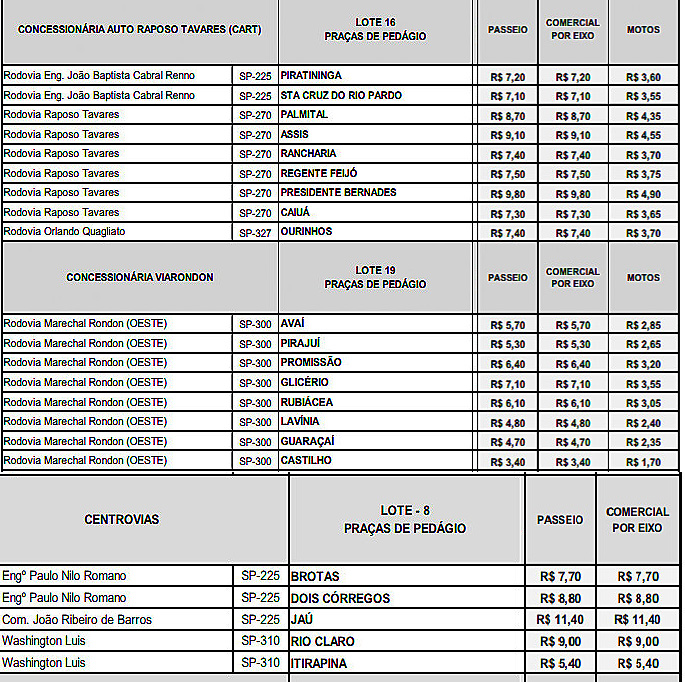 Entra em vigor à zero hora desta segunda-feira (1º) o reajuste contratual anual das tarifas de pedágio das rodovias estaduais de São Paulo. Estão incluídas praças localizadas em rodovias pela região, mas a SP-333 (recentemente assumida pela Entrevias) não foi incluída, mesmo porque começou a operar há pouco tempo.