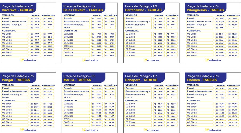 Os novos valores serão de R$ 7,70 na praça de Marília e de R$ 5,70 na de Echaporã, ambas na SP-333, rodovia administrada pela Entrevias.