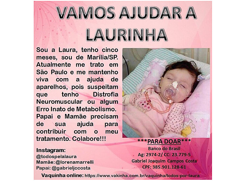 Através dessa mensagem nas redes sociais amigos e familiares da pequena Laura Cury Tanios Costa, de cinco meses de idade, informaram que finalmente foi obtida vaga especializada no Instituto das Crianças do Hospital das Clínicas de São Paulo. A criança respira com ajuda de aparelhos e se alimentando por meio de sonda por causa de uma doença que impede o movimento dos músculos, mas que ainda não foi diagnosticada.