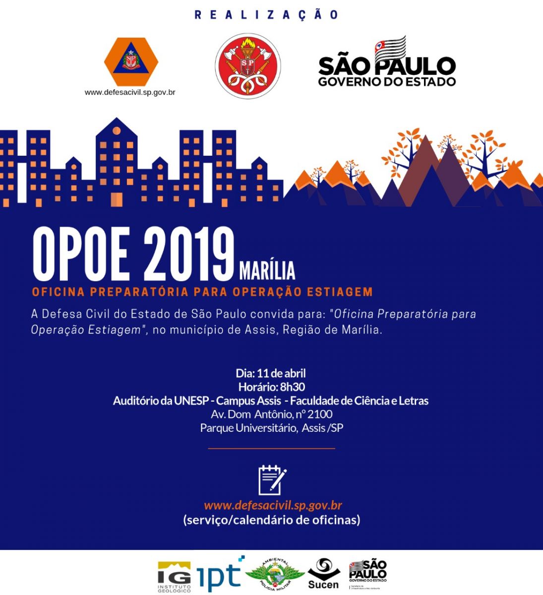 A Coordenadoria Estadual de Proteção e Defesa Civil do Estado, em parceria de órgãos como o Corpo de Bombeiros, Instituto de Pesquisas Tecnológicas (IPT), Instituto Geológico, realiza nesta quinta-feira (11), em Assis, mais uma edição da Oficina Preparatória para Operação Estiagem (OPOE) em todo o Estado de São Paulo. Participam brigadistas nomeados pelas Prefeituras da região, incluindo Marília.