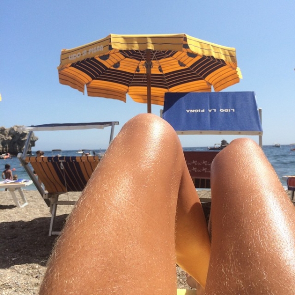 A loira publicou uma foto em que deixa as pernas à mostra na praia de Taormina's Beach, na Itália, e foi muito criticada pelos seguidores por conta do excesso de pelos nas pernas.