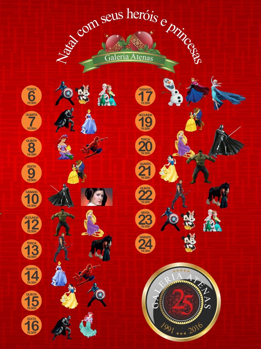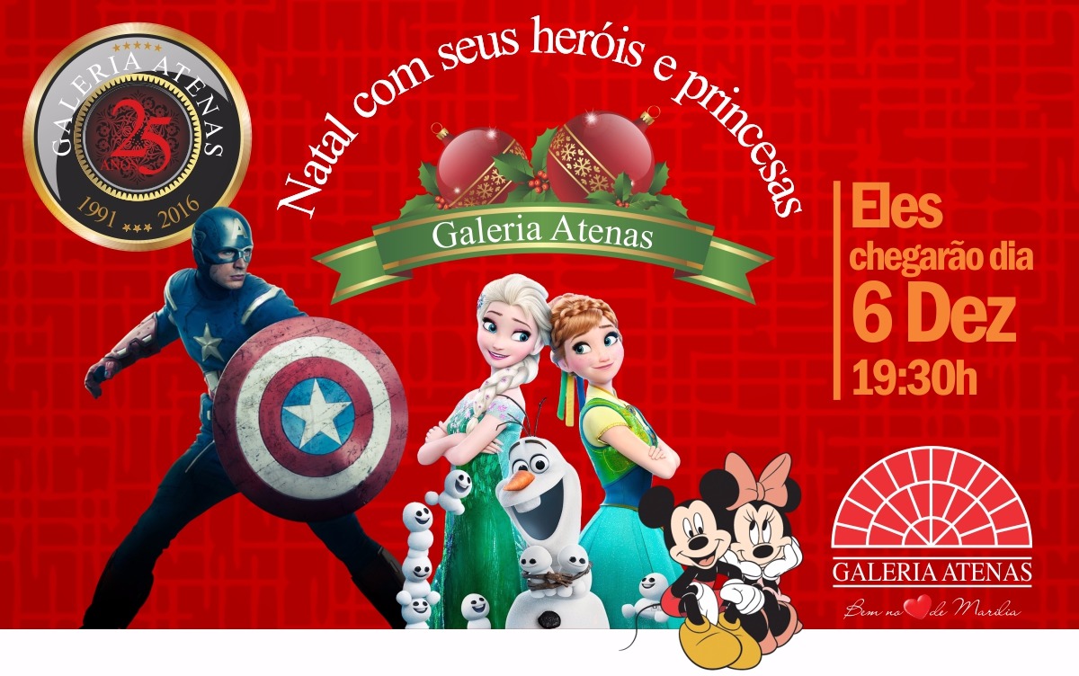 programação de Natal diferente este ano. Com o tema "Natal com os seus Heróis e Princesas", a partir de hoje (06) até o dia 23 de dezembro estarão passando pelo centro de compras 19 diferentes personagens (dois por dia).