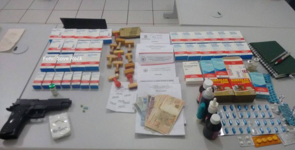 Na casa dele, foram encontrados 12 carimbos de médicos com CRM e CPF verdadeiros (alguns foram pessoalmente ao plantão registrar boletim de ocorrência contra o autor preso), receitas em branco, simulacro e quatro comprimidos de ecstasy (foto/esquerda).
