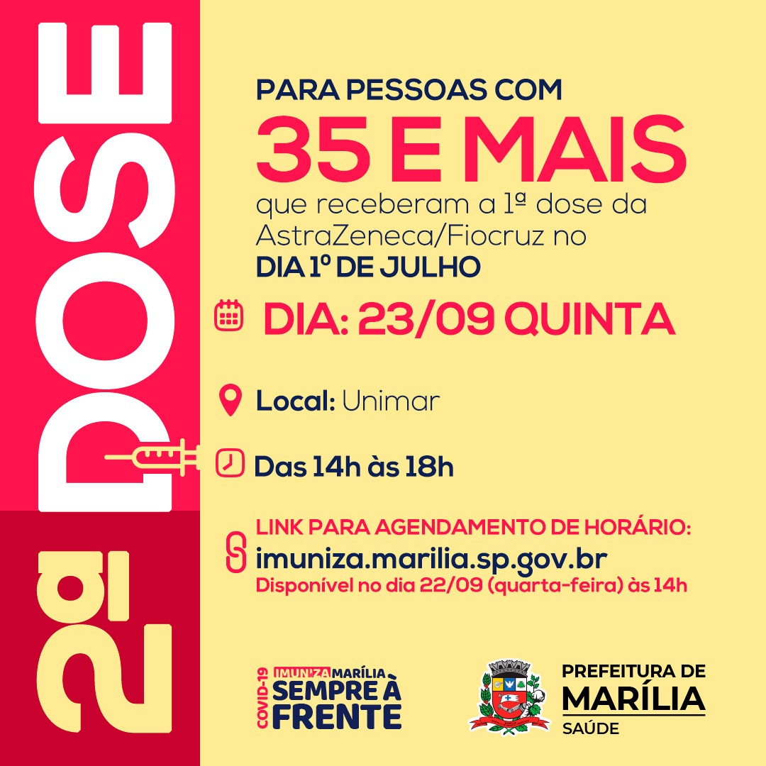 A Secretaria Municipal da Saúde de Marília, marcou para esta quinta-feira a aplicação da segunda dose da vacina contra a Covid-19 para a população de 35 anos e mais, que recebeu a primeira dose da Astrazeneca/Fiocruz no último dia 1º de julho.