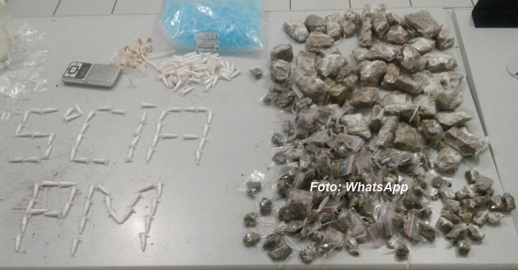 Foram apreendidas: 140 porções de cocaína, de 50 porções grandes de maconha (ainda seriam fracionadas para a venda), outras 183 porções da mesma droga já prontas para comercialização, 25 de crack, bem como um saco com pinos vazios e um delular.