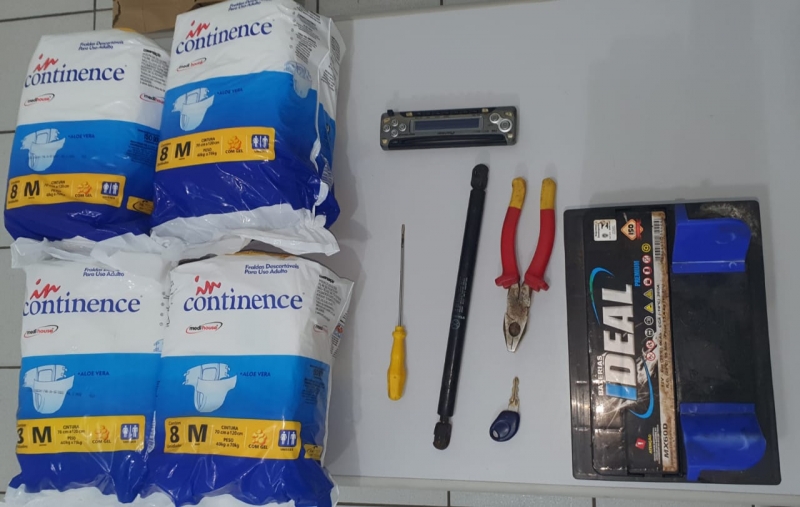 Com ele os policiais localizaram: uma chave de fenda, um alicate e uma chave de carro Fiat. Já na caixa de papelão que ele carregava havia uma bateria automotiva e na sacola quatro pacotes de fraldas geriátricas, um aparelho de som automotivo e um amortecedor da tampa traseira do porta mala.