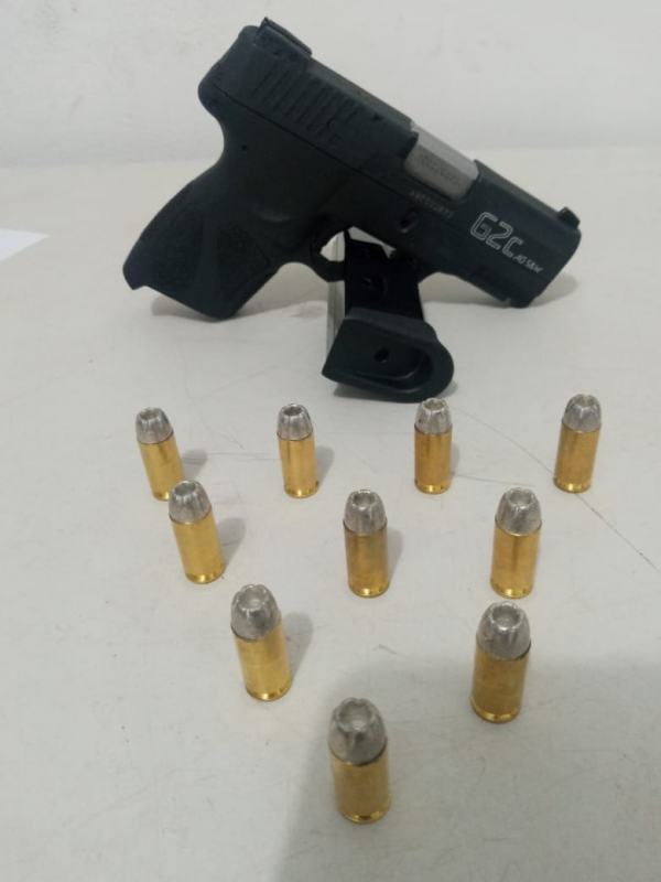 Durante a vistoria foram encontradas sobre o banco traseiro do veículo um coldre contendo uma pistola .40 e um carregador com 10 munições intactas.