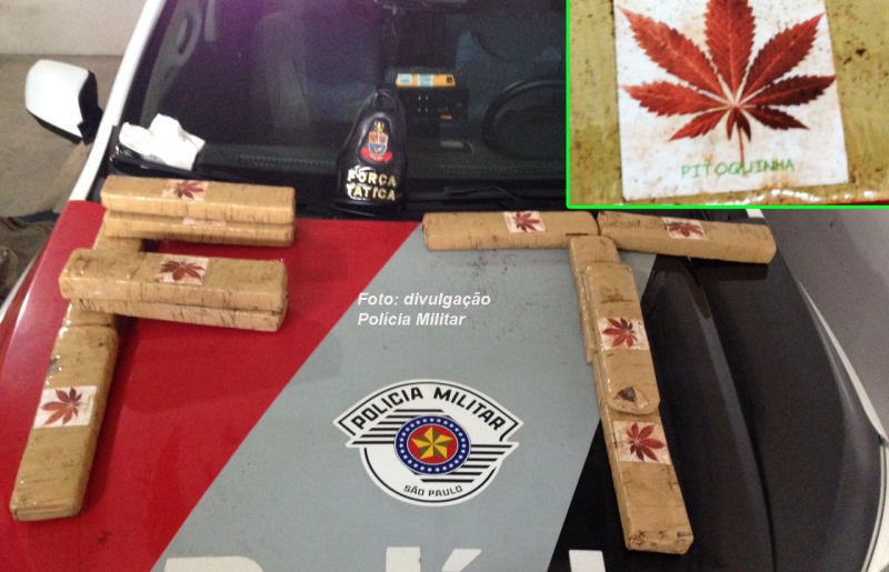 Cerca de 14 quilos de maconha, divididos em 11 tabletes e com uma inscrição no mínimo curiosa (a folha que representa da maconha e a palavra "pitoquinha") foram