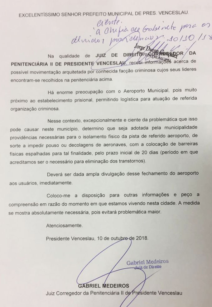 Conforme a Prefeitura, “a preocupação é atinente ao aeroporto municipal, que fica próximo ao estabelecimento prisional, que seria utilizado como logística para eventual ação criminosa que estaria em curso”.