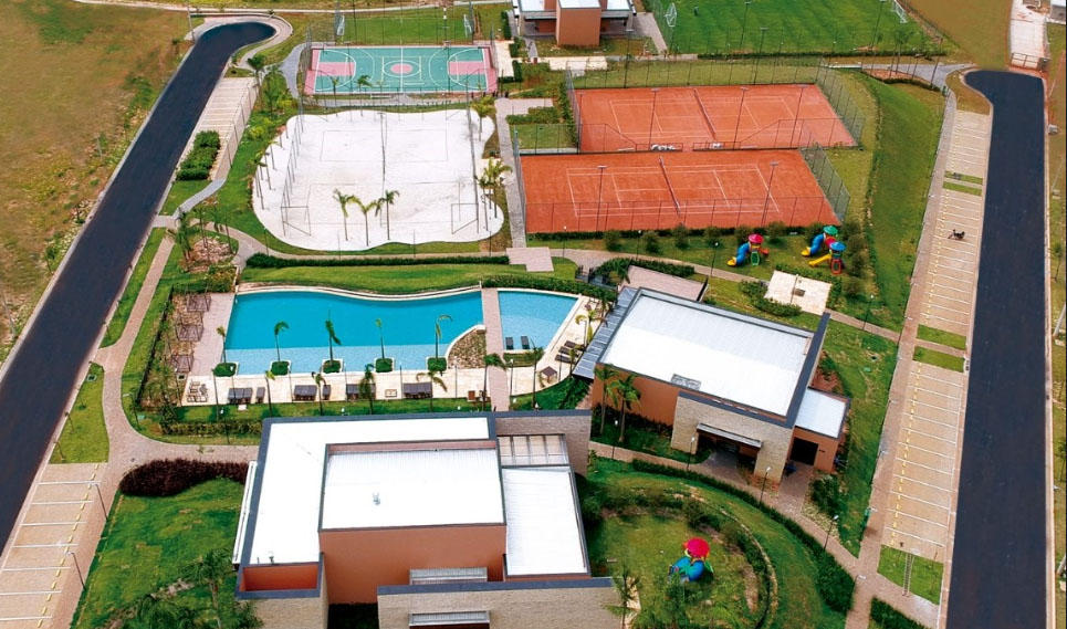 Salão de festas, praças, ciclofaixa e pista para caminhadas, pomar, terraço com churrasqueira, lounge gourmet com vista para o vale, área gourmet, SPA, sala de descanso e sala de massagem, sauna úmida, vestiários, piscina adulto com borda infinita e vista para o vale, piscina infantil, fitness center, duas quadras de tênis de saibro iluminadas, duas quadras de “beach tennis” e vôlei de areia iluminadas, mini campo de futebol Society iluminado, campo de futebol iluminado, quadra poliesportiva iluminada, quadra de squash, a Varanda Casa Cascata e pergolado.