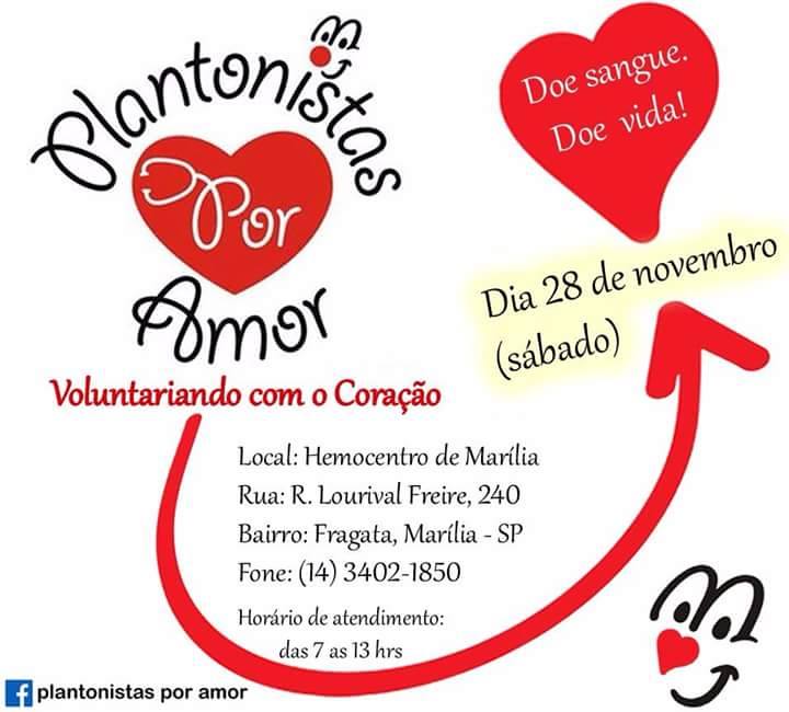 Os voluntários do grupo "Plantonistas por Amor" realizam neste sábado mais um ato de amor ao próximo. Além de levar alegria à pacientes de hospitais e campanhas em entidades, neste sábado eles estarão no Hemocentro para doação de sangue. Eles estão preocupados com as constantes quedas de doações e, dessa forma, participam da campanha.