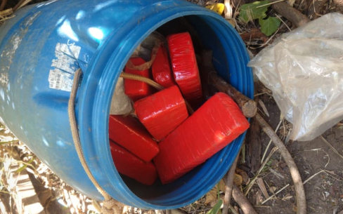 Equipes policiais fizeram a varredura no local denunciado onde localizaram três tonéis enterrados com grande quantidade de tijolos de maconha, cocaína, além de balança de precisão e apetrechos para o tráfico.