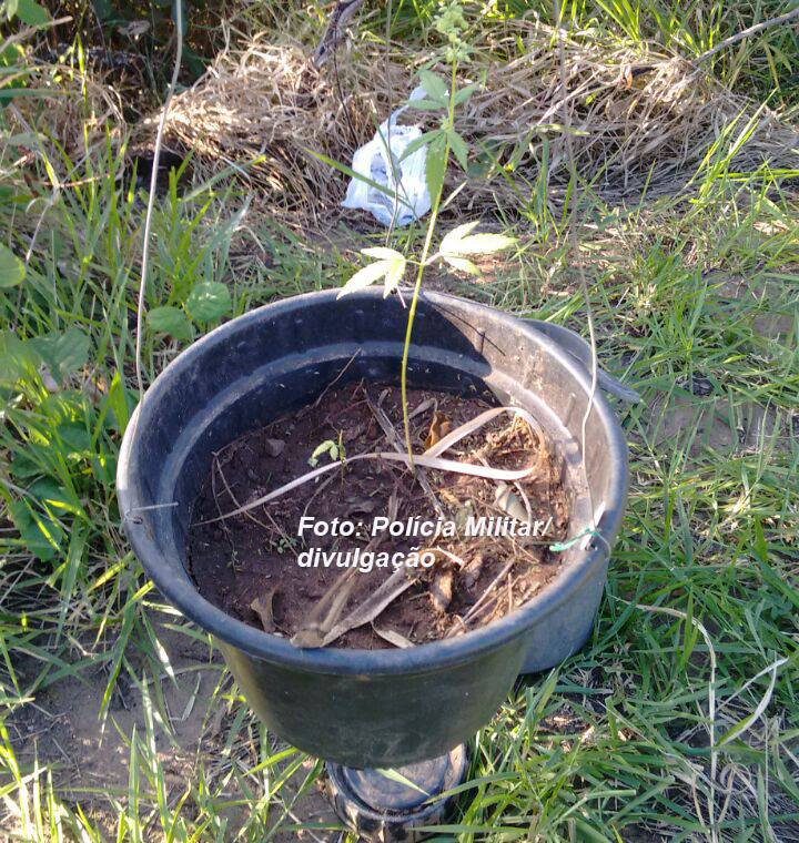 apreendidos cerca de 60 quilos de maconha que estavam dentro de um saco e enterrados num pasto. No local, também foi localizado um pé da mesma droga que havia sido plantado num vaso pelos traficantes.