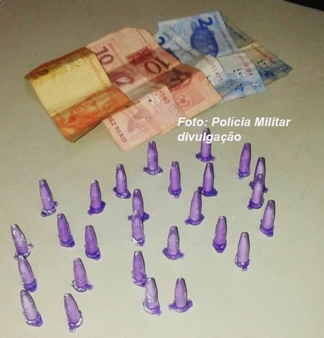 No local, os policiais flagraram o suspeito servindo um motoqueiro e condutor de um veículo Gol. Ele foi acabou abordado e encontrados R$46,00 em notas diversas e também 27 microtubos de cocaina.