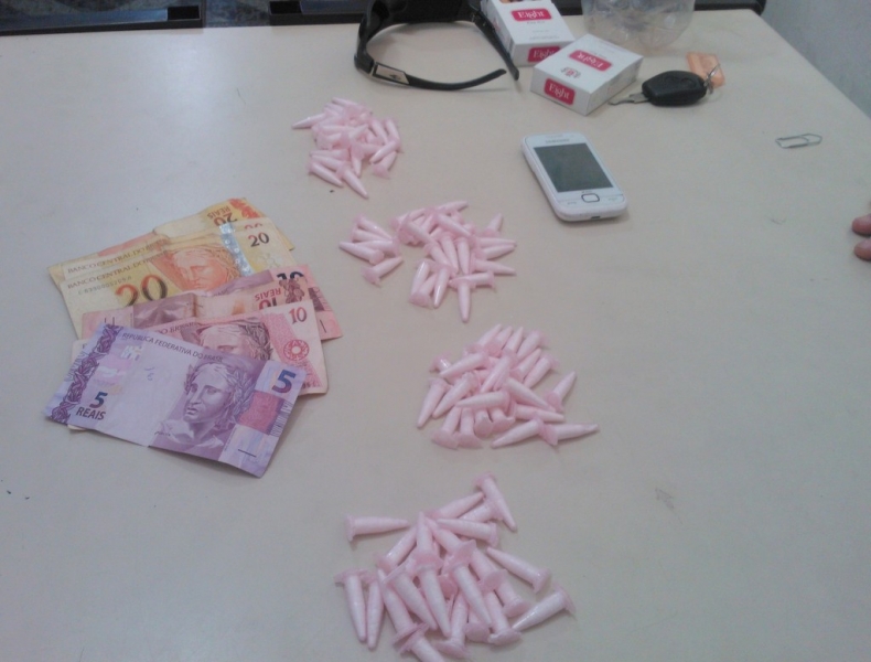 Um deles estava com a quantia de R$ 95 em dinheiro, sendo que em vistoria pelas imediações, os policiais encontraram 100 pinos contendo cocaína.