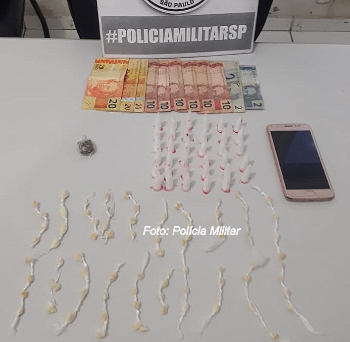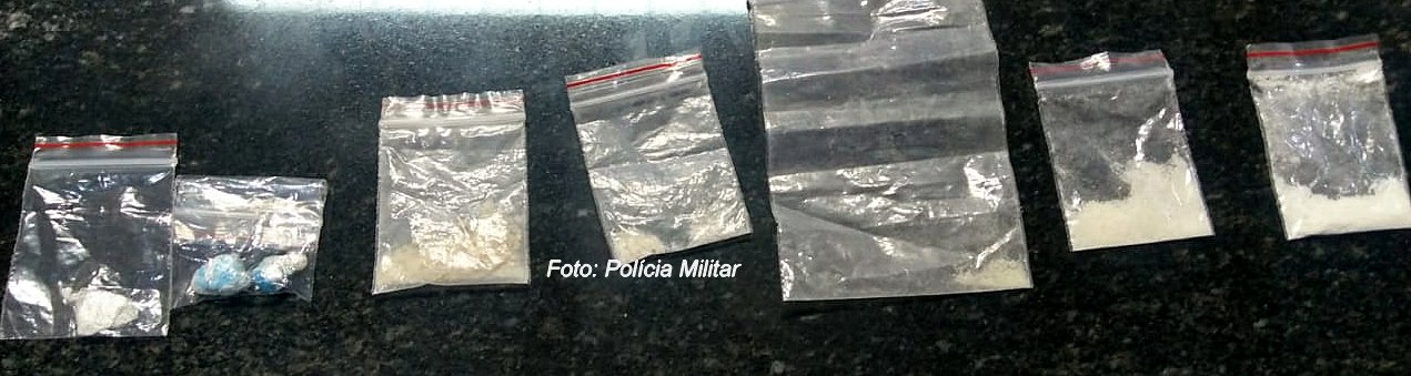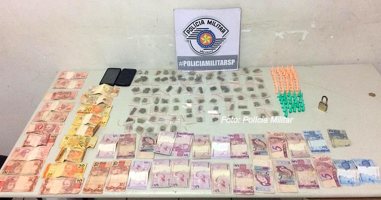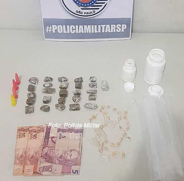 Com ele, foram apreendidas, dentro de frascos de remédioo, 26 porções de maconha, 31 pedras de crack e quatro pinos de cocaína; dinheiro, celular e contabilidade do tráfico.
