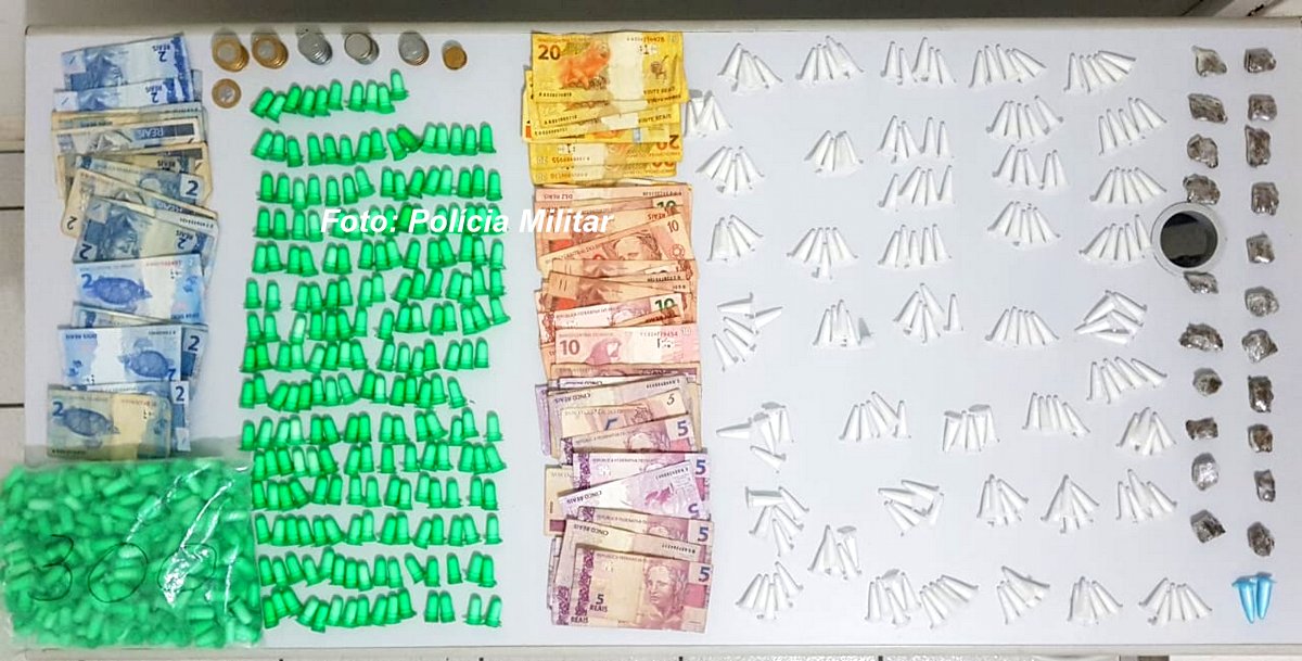 Dentro da mochila, foram apreendidos 733 pinos de cocaína, 21 trouxas de maconha e R$ 594,25 em notas diversas. O rapaz, identificado como G.M.S., de 19 anos foi preso em flagrante e será apresentado em audiência de custódia.
